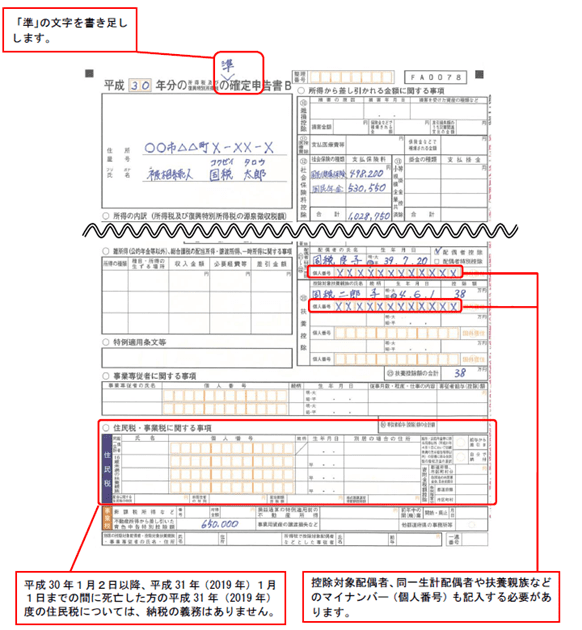 申告書名に「準」または「準確定」の文字を書き足すこと。